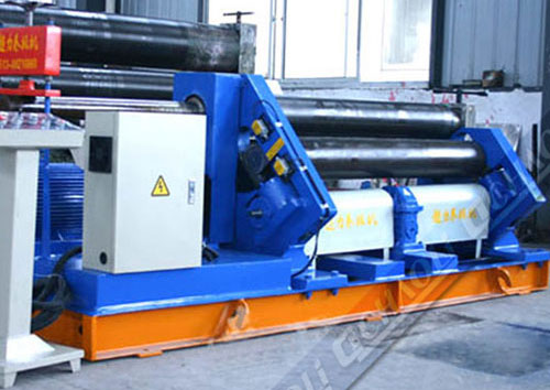 該機(jī)結(jié)構(gòu)型式為三輥非對(duì)稱式,下輥為主傳動(dòng),并做垂直升降運(yùn)動(dòng),以便夾緊板材。通過(guò)下輥齒輪與上輥齒輪嚙合,同時(shí)作為主傳動(dòng),側(cè)輥?zhàn)鲀A升降運(yùn)動(dòng)。具有預(yù)彎、卷圓多重功能,結(jié)構(gòu)緊湊操作維修方便。